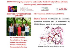 El proyecto tiene como objetivo la identificación de candidatos preclínicos efectivos con actividad antiviral para el tratamiento de la COVID-19. Para la consecución de este objetivo, utiliza dos estrategias, una basada en el cribado de alto rendimiento de las colecciones internas del Grupo y otra basada en el diseño racional.
